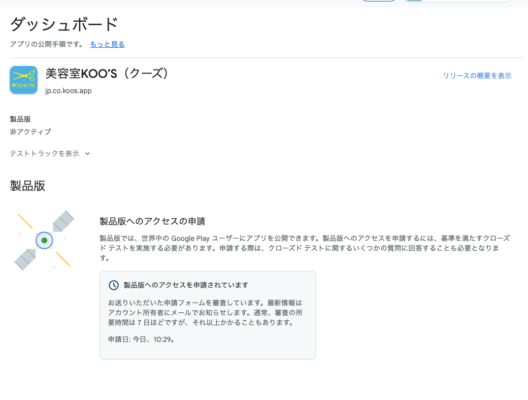 iPhoneアプリ申請は簡単な説明文と画像で終わったのに、Androidは提出する画像も多いし、記入する項目もiPhoneアプリ申請の10倍くらいあり、書類審査的なのが通ったら今度はテスター12人に14日間のテストをしてもらってから最終審査があり、今やっと14日間のテスト期間が終わったので、最終審査に申請しました。